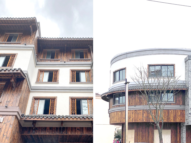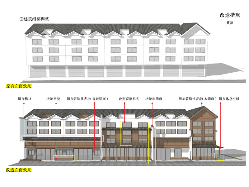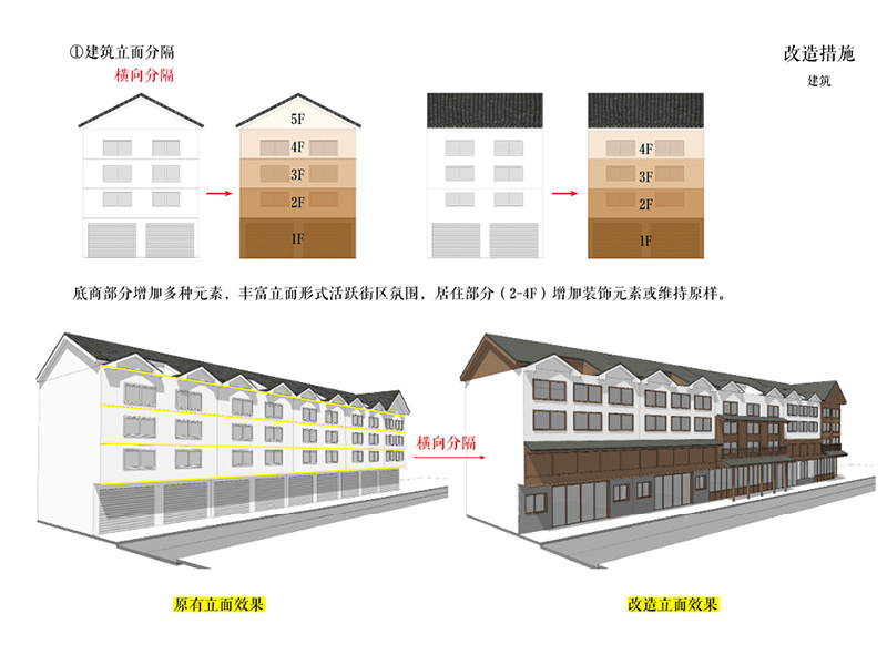 底商部分增加多种元素,丰富立面形式活跃街区氛围,居住部分(2-4F)增加装饰元素或维持原样。
