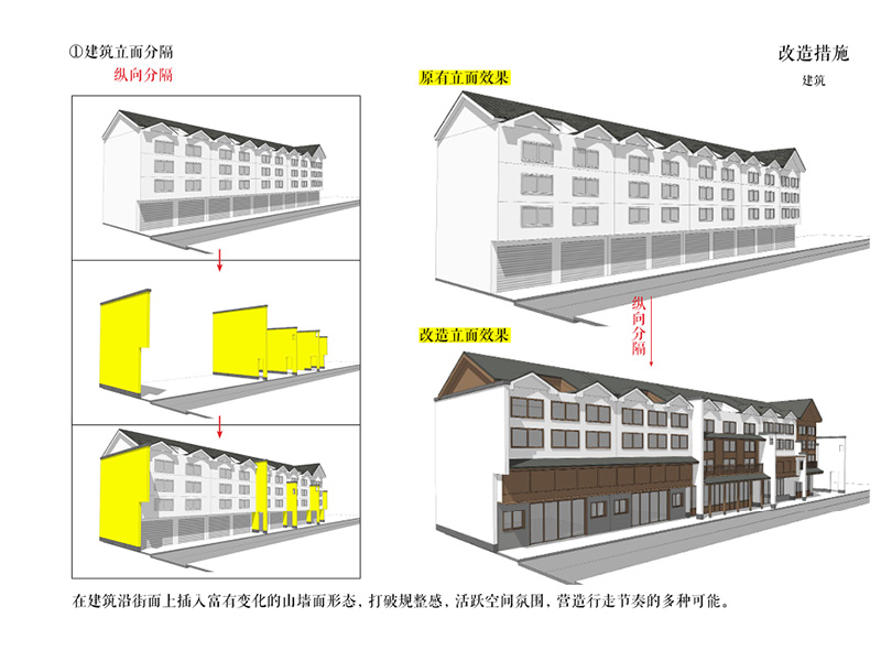 在建筑沿街面上插入富有变化的山墙面形态,打破规整感,活跃空间氛围,营造行走节奏的多种可能。